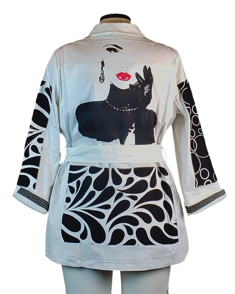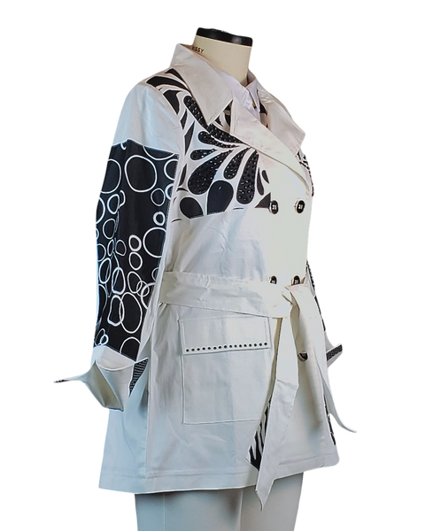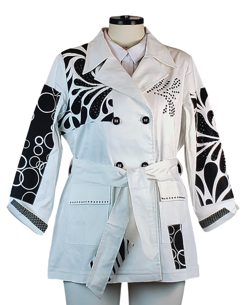 Elevate your outerwear with this artistic take on the trench coat! The classic white double-breasted silhouette is updated with striking black graphic prints and embellishments. You'll love the mix of swirling paisley patterns on the sleeves and the playful circle motifs on the pockets. Subtle stud or bead detailing on the lapel adds a touch of custom sparkle. The waist-cinching belt allows you to tailor the fit for a look that's polished, unique, and unforgettable.