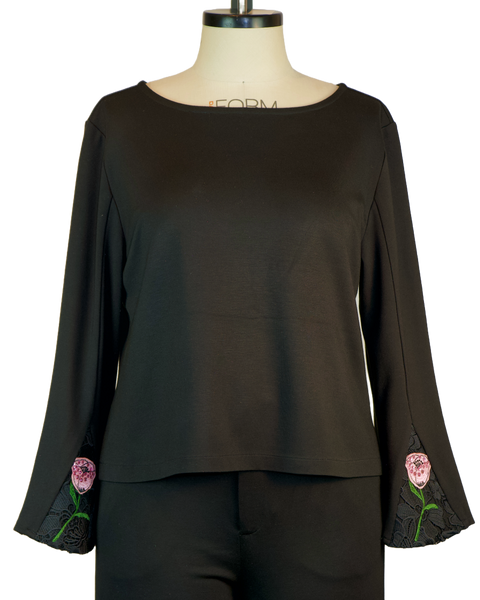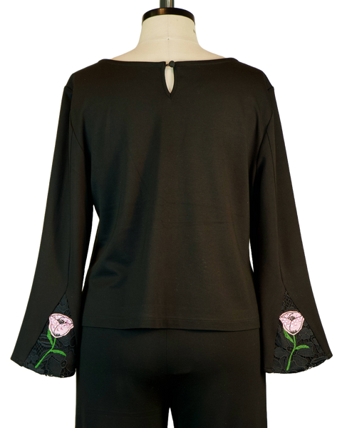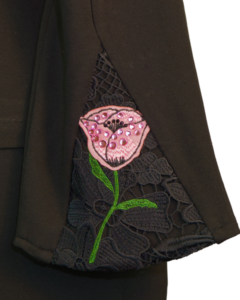 Artistic Sleeve Detail: Dramatic flared sleeves feature a stunning triangular inset of black lace, topped with a vibrant pink rose appliqué and green stem embroidery.