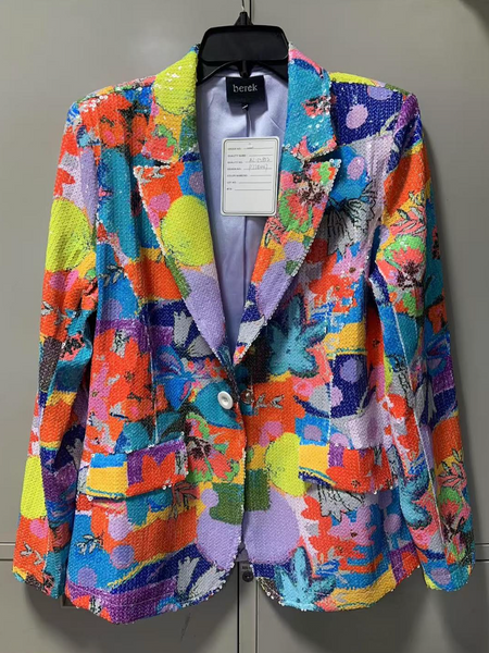 Make a stunning entrance with the Calypso Get-Away Sequin Blazer, a vibrant statement piece designed to bring a tropical, high-energy flair to your wardrobe. This blazer combines a classic tailored silhouette with an all-over explosion of color and shimmer.