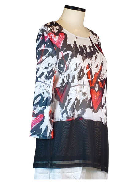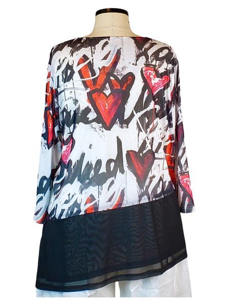 This lightweight mesh tunic is adorned with a striking heart graffiti print. It is designed with 3/4 sleeves, a stylish diagonal hemline, and an eye-catching embellishment of scattered black rhinestones on the front, adding a touch of sparkle. Additionally, it is fully lined to ensure optimal comfort and offers a flattering fit, making it an ideal choice for various festive occasions.