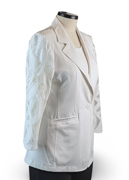 Intricate Sculpted Lace Sleeves: Features stunning three-quarter length sleeves made from dramatic, open-work sculpted lace, adding a romantic and airy dimension to the classic blazer silhouette.