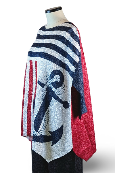 Artistic Nautical Design: Featuring a bold, asymmetrical mix of classic navy stripes, vibrant red vertical lines, and a large, stylized anchor, this top captures the spirit of the sea with a contemporary twist.