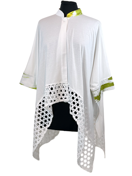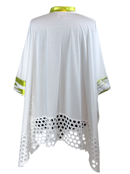 Achieve instant resort-level elegance with this stunning, flowy top! The effortless drape of the pure white fabric creates a flattering silhouette that moves beautifully. The unique design features a chic mandarin collar with a pop of lime green contrast trim, and a single button closure. The standout detail is the striking laser-cut woven border along the hem, giving it a high-end, artisan finish. This piece is perfect for layering over a dress or pairing with tailored trousers for a sophisticated look.