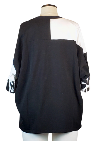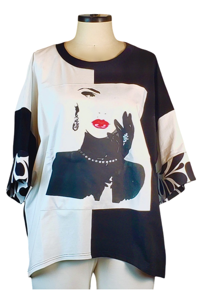 Looking for a unique top that offers instant high fashion? This piece is defined by its monochromatic chic and clever design. The top's surface is split into black and white blocks, framing the elegant portrait beautifully. Its flowy, generous fit is effortlessly stylish, and the cuff details add a subtle, playful texture. It’s the ultimate top for the customer who loves graphic art and comfortable, head-turning style.