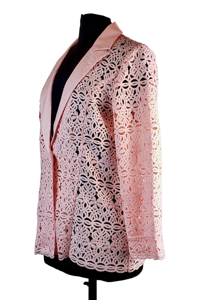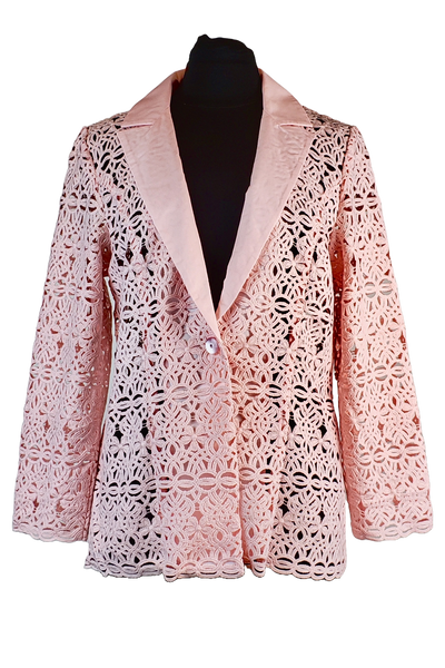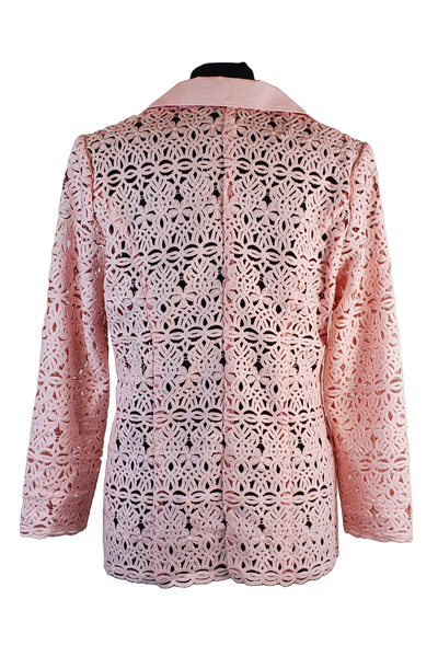 Elevate your ensemble with the Trellis Lace Jacket, a sophisticated layering piece featuring an intricate, all-over floral openwork design. Presented in an elegant blush pink, this jacket blends romantic texture with a polished, structured silhouette.