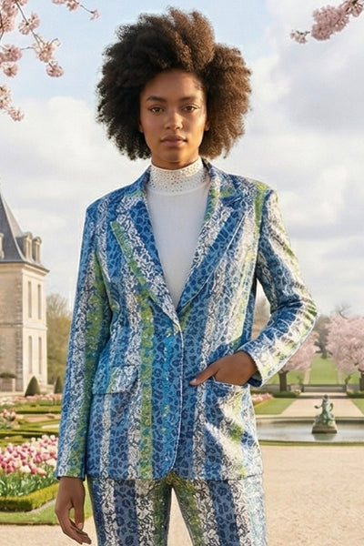 Looking for a jacket with serious depth and sparkle? This blazer features a unique, multi-layered print and texture that gives the appearance of metallic sheen or subtle sequins. The vertical stripes are incredibly flattering and leg-lengthening. Wear it buttoned up as a sophisticated top or open as a light layer over a simple black dress. This is a versatile, high-impact piece for the customer who loves bold colors and confident style.