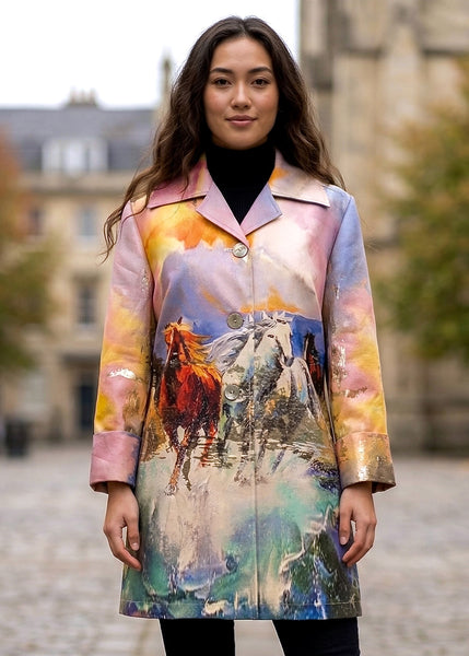 Unleash your free spirit with the Wild Horses Topper, a wearable masterpiece that blends artistry with elegance. Featuring a breathtaking, hand-painted-style design of galloping horses against a dreamlike sky, this statement piece embodies movement, power, and untamed beauty. Crafted from a luxurious, lightweight fabric, it drapes effortlessly for a flattering fit. The classic button-front closure and tailored collar add refinement, while the painterly hues of sunset golds, deep blues, and earthy tones make this topper a true showstopper. Whether layered over evening attire or paired with denim for a sophisticated edge, this piece is an ode to bold, unbridled style.
